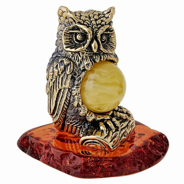Фигурка из бронзы и янтаря "Птица Филин на пне с шаром" №1303K