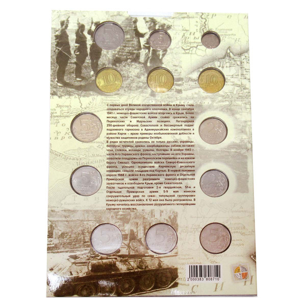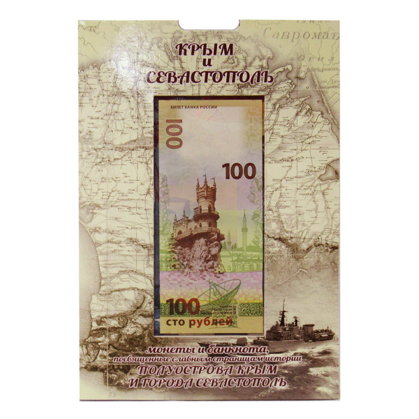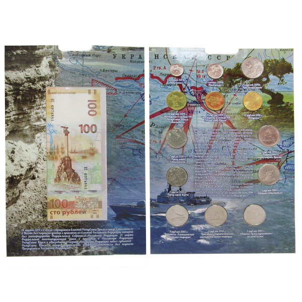 Коллекционный альбом "Крым и Севастополь". 2 монеты по 2 рубля, 6 монет по 5 рублей, 3 монеты по 10 рублей, 5 коп 2014 г.., 1 коп. 2014 г. и одна банкнота 100 рублей (Крым-Севастополь).