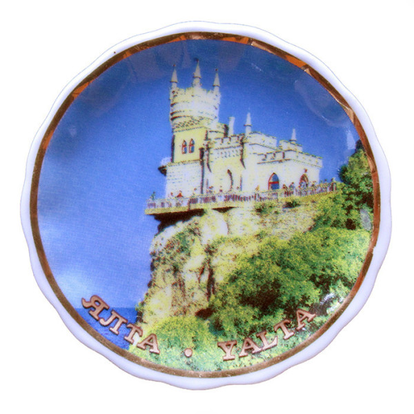 Магнит из фарфора "Ялта" в виде тарелочки с изображением Ласточкинго Гнезда.