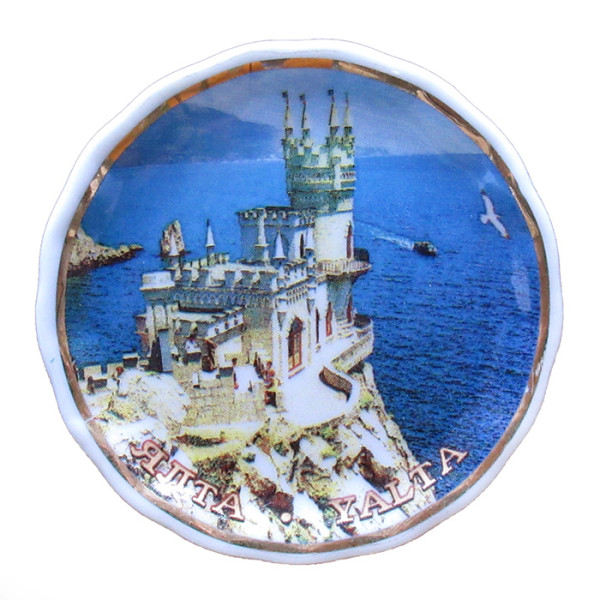 Магнит из фарфора "Ялта" в виде тарелочки с изображением Ласточкинго Гнезда.