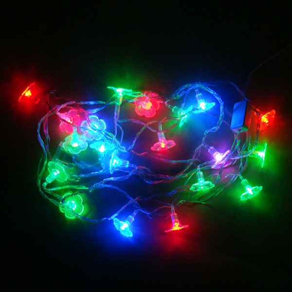 Светодиодная гирлянда состоит из трех метрового прорезиненного провода, на котором расположены цветки. В каждом цветке установлены три светодиодных кристалла разных цветов, которые при включении гирлянды в электрическую сеть плавно переливаются цветами. Есть возможность подключения гирлянд на один кабель питания.