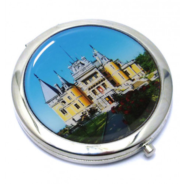 Зеркало металлическое, двустороннее, круглое, на защелке с изображением Массандровского дворца.