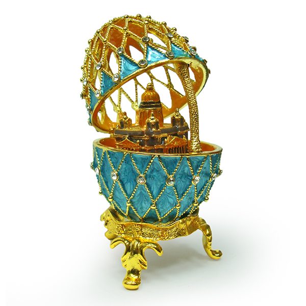 Яйцо-шкатулка под Фаберже, ажурное, внутри Исаакиевский собор на магните. Изготовлено из металла. Украшено стразами.