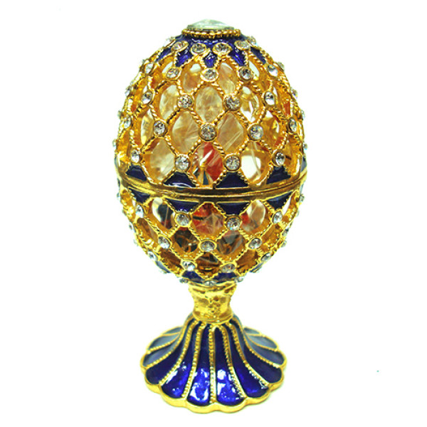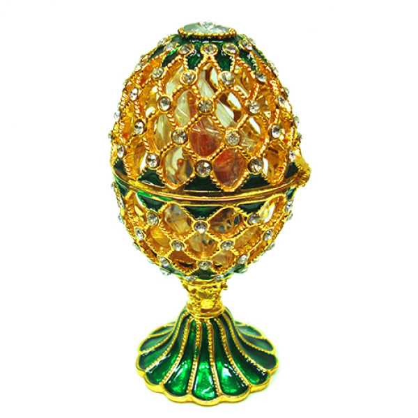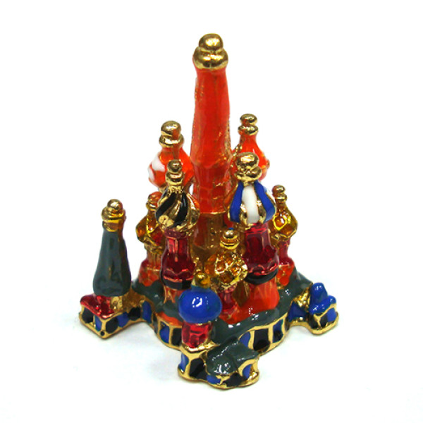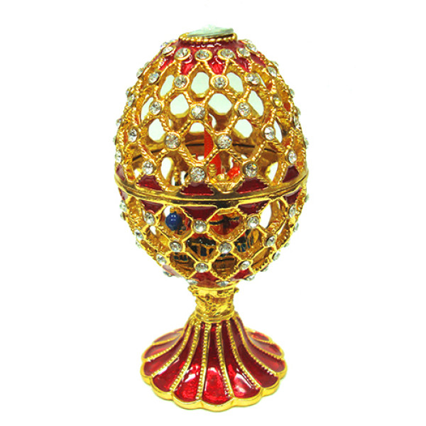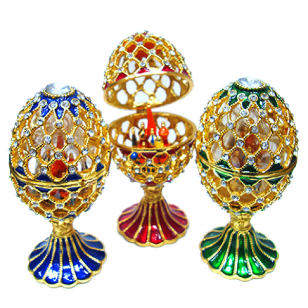 Яйцо-шкатулка под Фаберже внутри с фигуркой храма Василия Блаженного на магните. Изготовлено из металла. Украшено стразами.