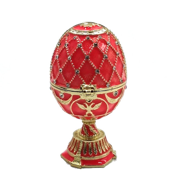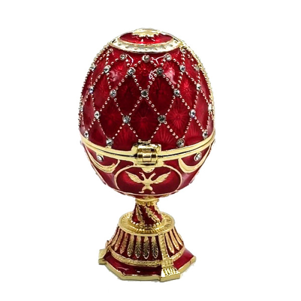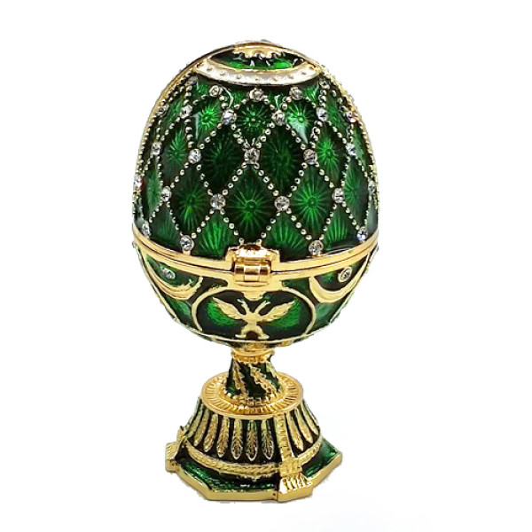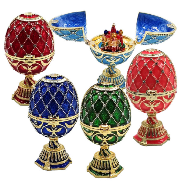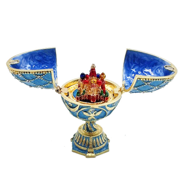 Яйцо-шкатулка под Фаберже, внутри с храмом Василия Блаженного на магните. Изготовлено из металла, покрыто цветной эмалью, украшено стразами.