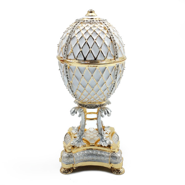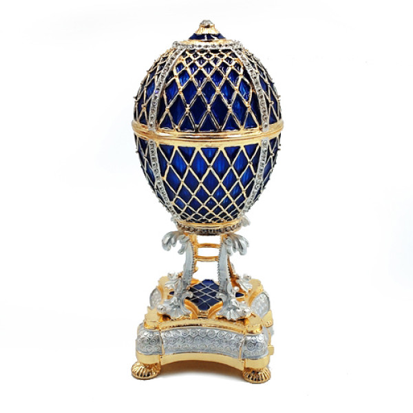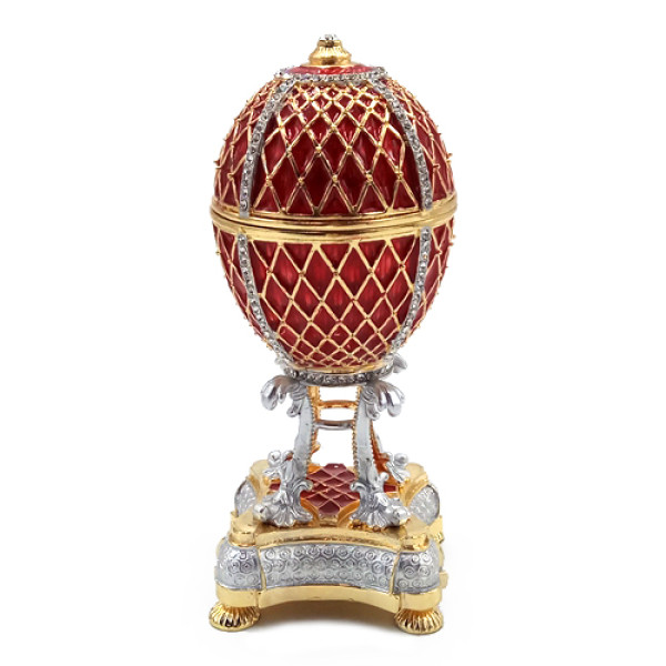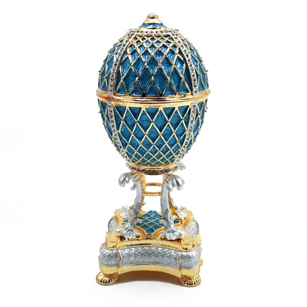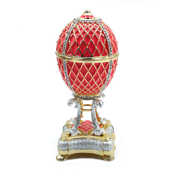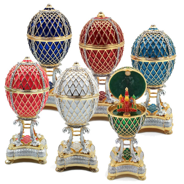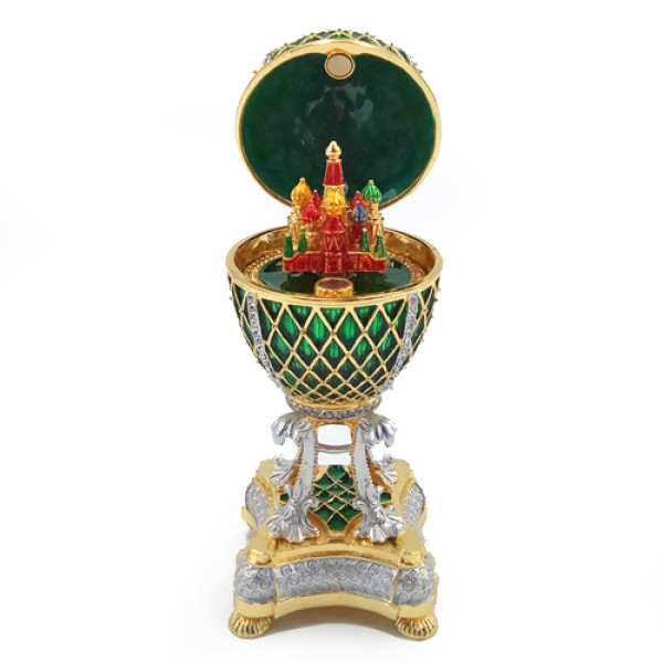 Яйцо-шкатулка под Фаберже, внутри с храмом Василия Блаженного на магните. Изготовлено из металла, покрыто цветной эмалью, украшено стразами.