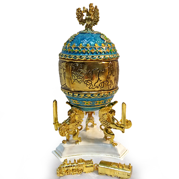 Яйцо-шкатулка под Фаберже. Внутри паровоз с вагоном. Изготовлено из металла. Украшено стразами.