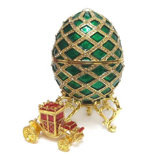 Яйцо-шкатулка под Фаберже, всередине с каретой. Изготовлено из металла. Украшено стразами.