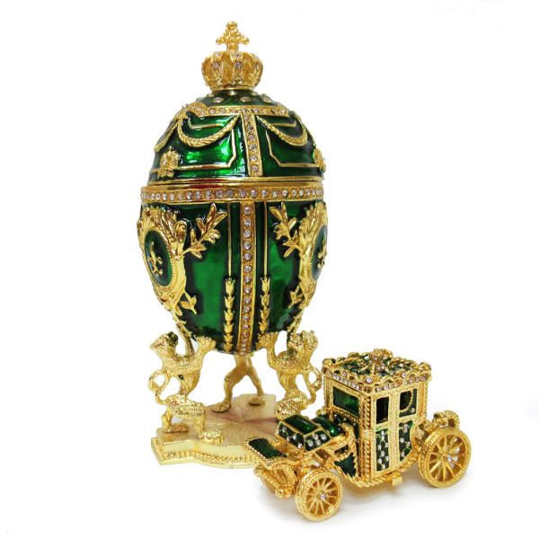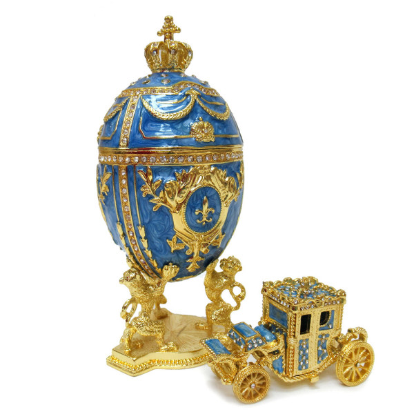 Яйцо-шкатулка под Фаберже внутри с каретой. Изготовлено из металла. Украшено стразами.