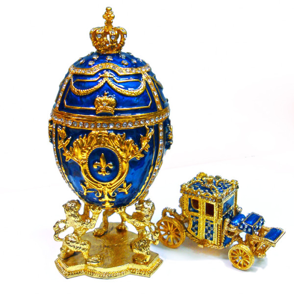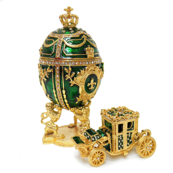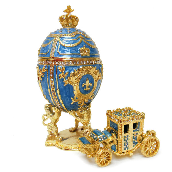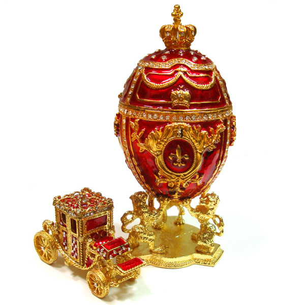 Яйцо-шкатулка под Фаберже внутри с каретой. Изготовлено из металла. Украшено стразами.