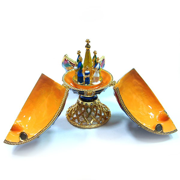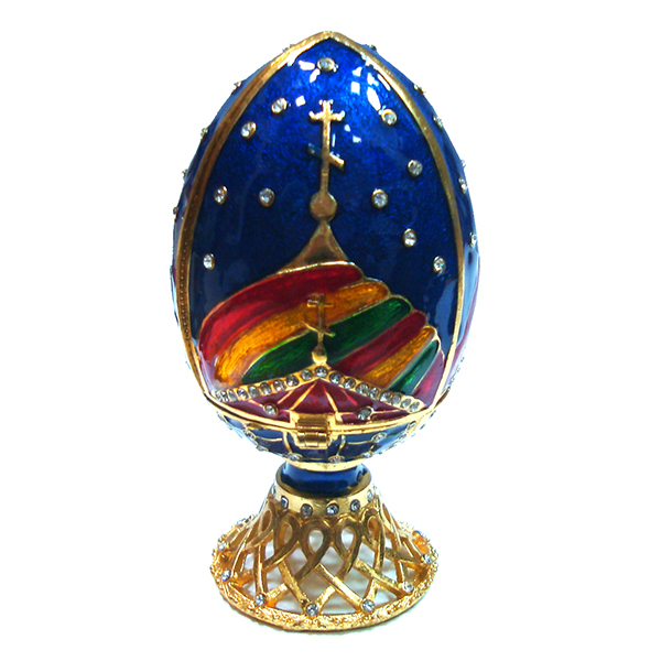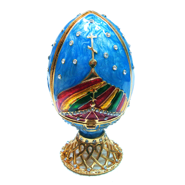 Яйцо-шкатулка под Фаберже. Внутри с фигуркой собор Василия Блаженного, на магните. Изготовлено из металла. Украшено стразами.
