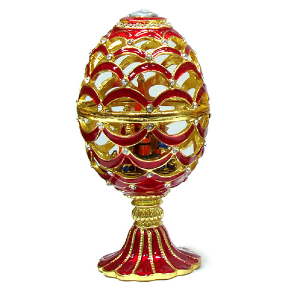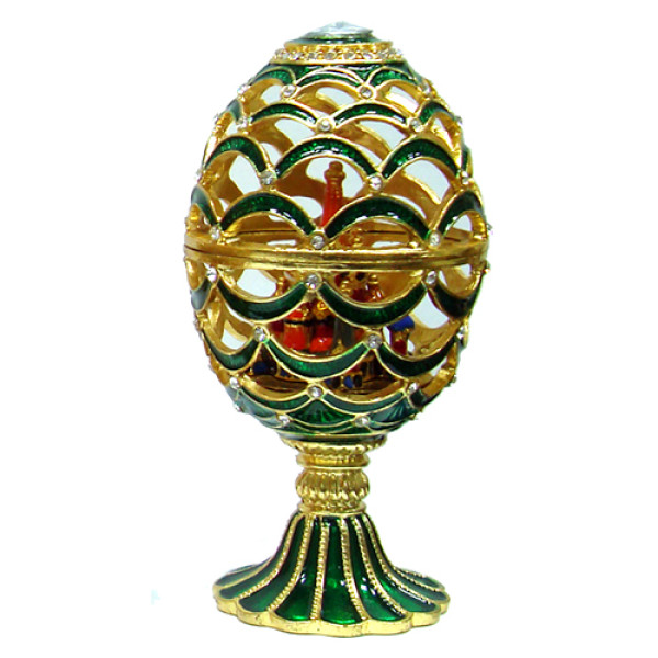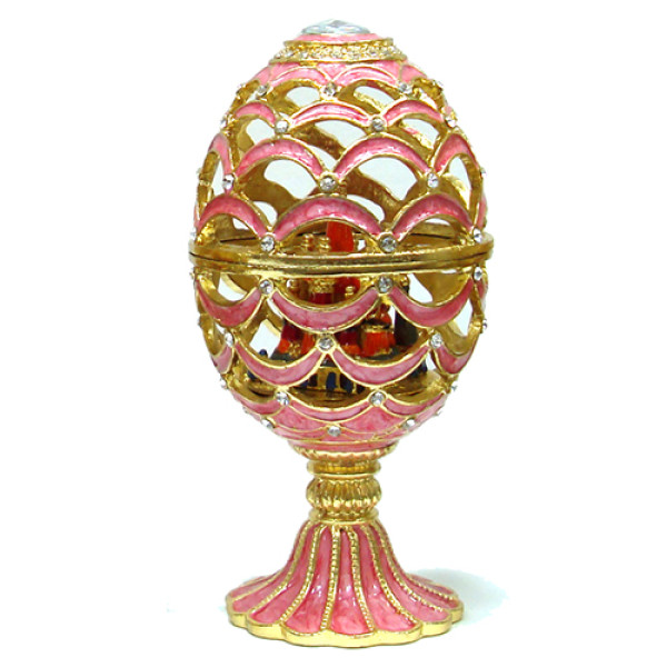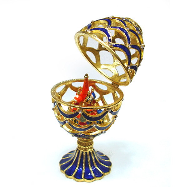 Яйцо-шкатулка под Фаберже Ажурное, всредине фигурка храма Василия Блаженного на магните. Изготовлено из металла. Украшено стразами.