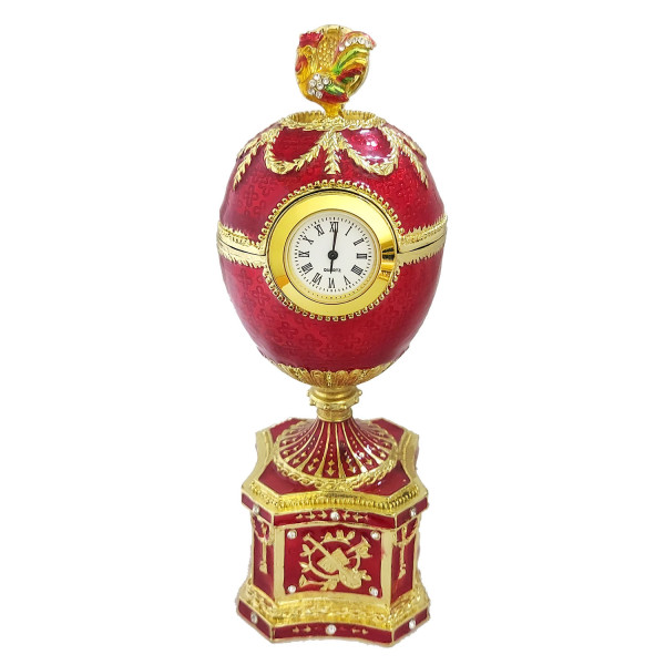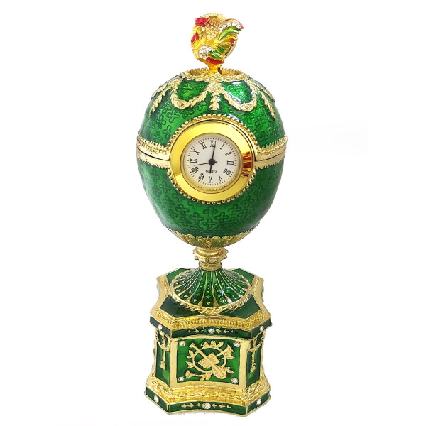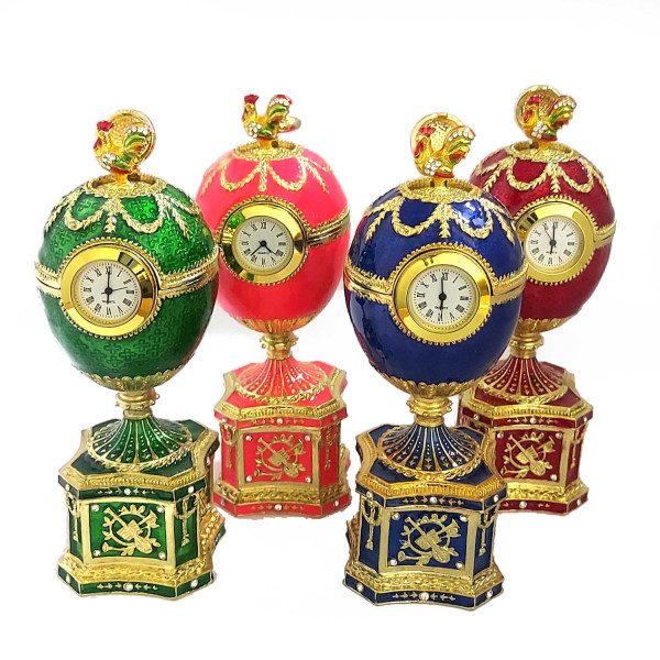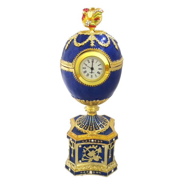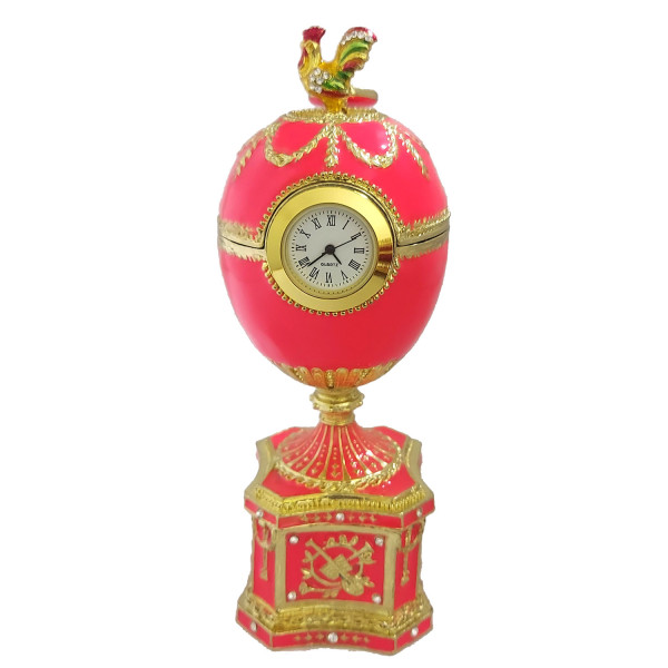 Яйцо-шкатулка под Фаберже с часами. Изготовлено из металла, покрыто цветной эмалью. Украшено стразами.