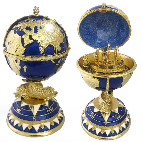 Яйцо-шкатулка под Фаберже в виде глобуса внутри с кораблем. Изготовлено из металла, покрыто цветной эмалью. Украшено стразами.