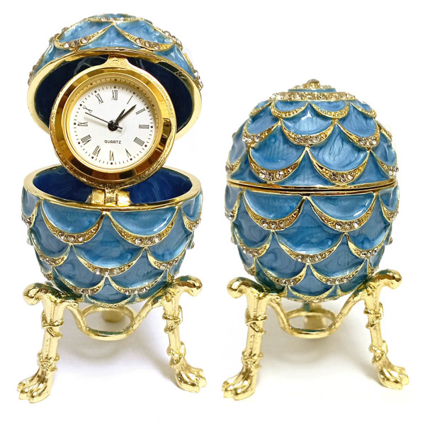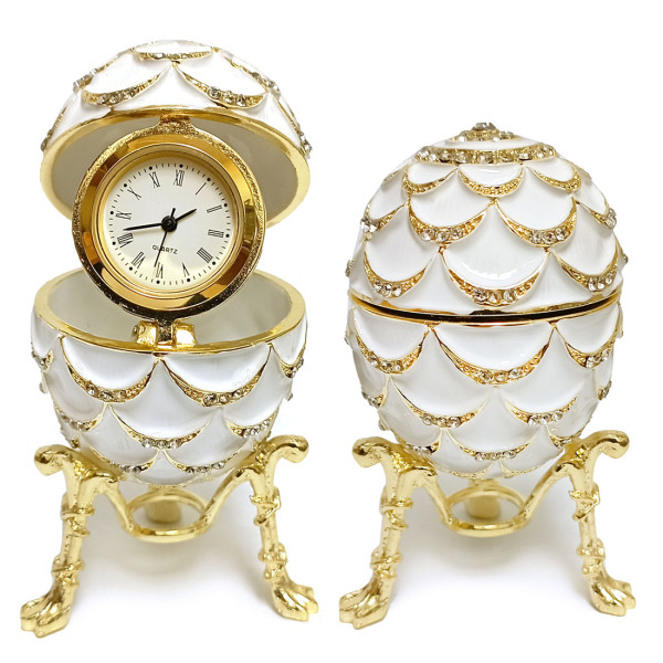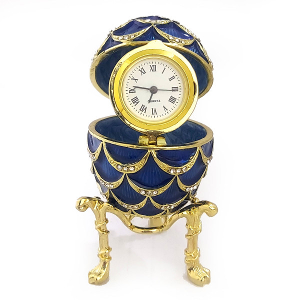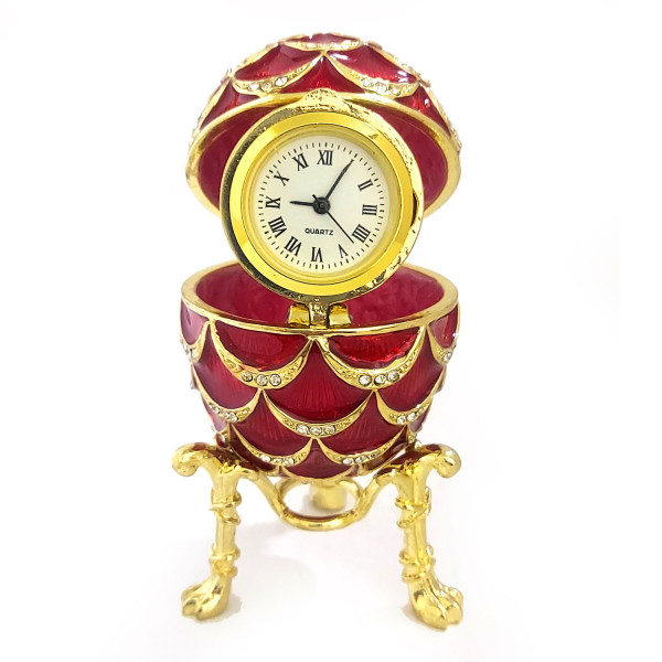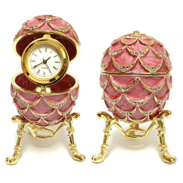 Яйцо-шкатулка под Фаберже внутри с часами. Изготовлено из металла, покрыто цветной эмалью. Украшено стразами.
