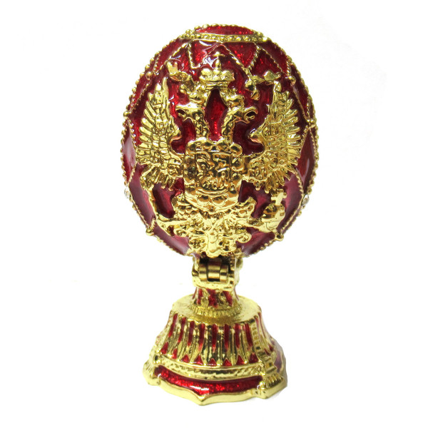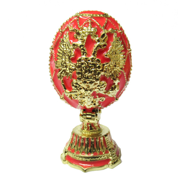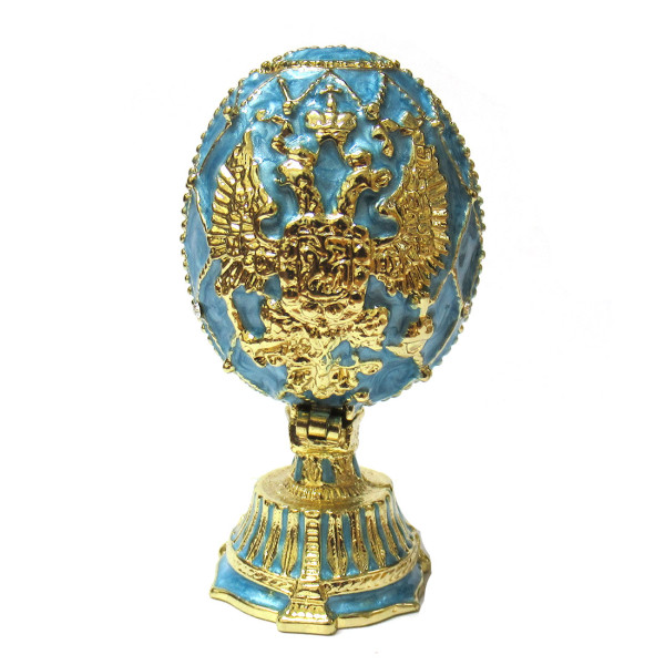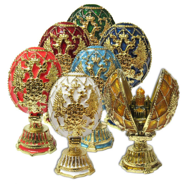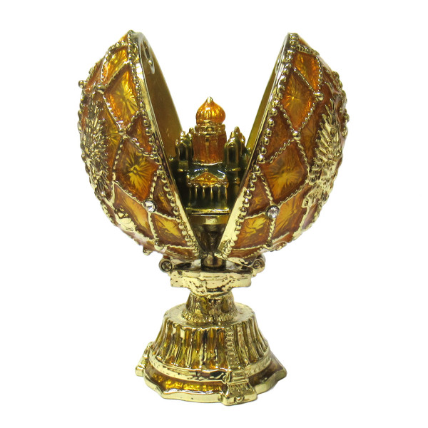 Яйцо-шкатулка под Фаберже внутри с Исаакиевским собором. Изготовлено из металла, покрыто цветной эмалью. Украшено стразами.