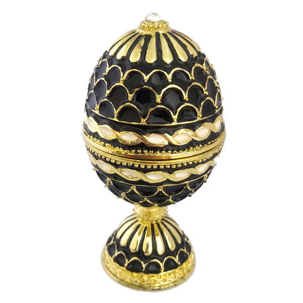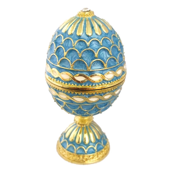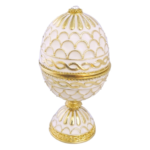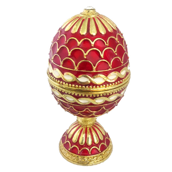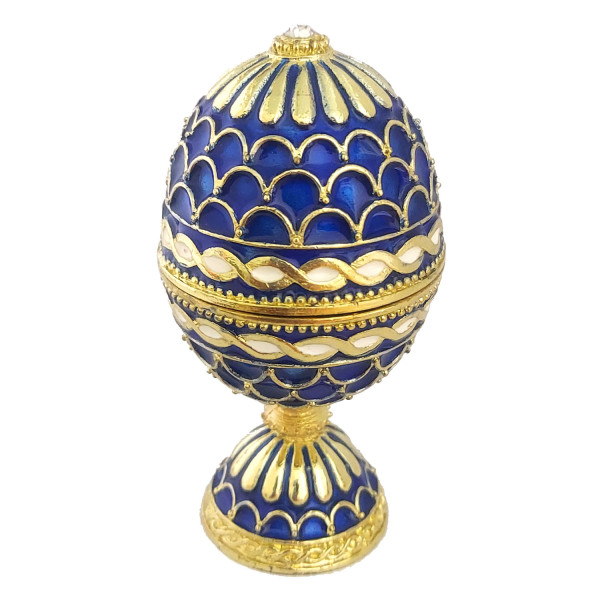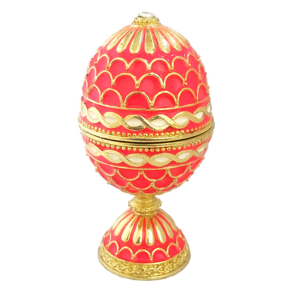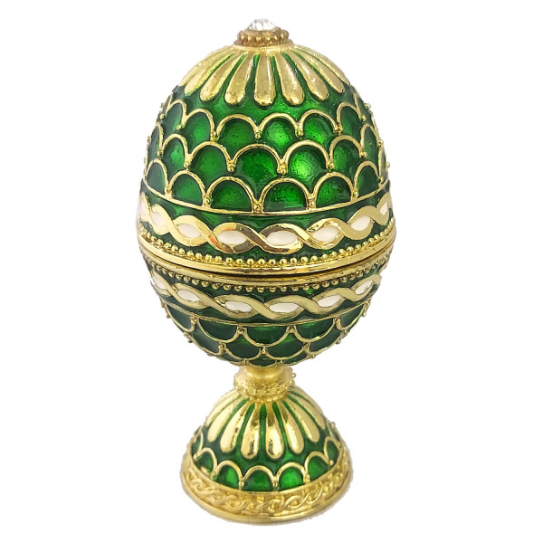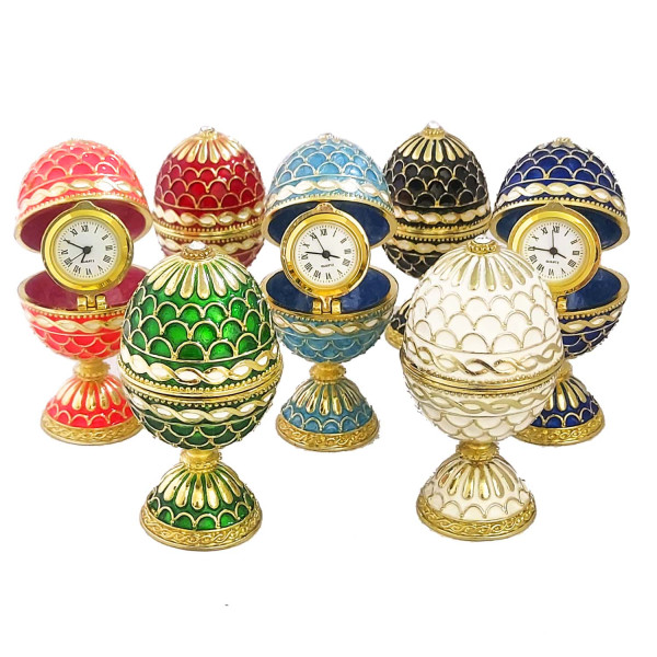 Яйцо-шкатулка под Фаберже внутри с часами. Изготовлено из металла, покрыто цветной эмалью. Украшено стразами.