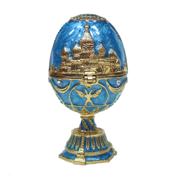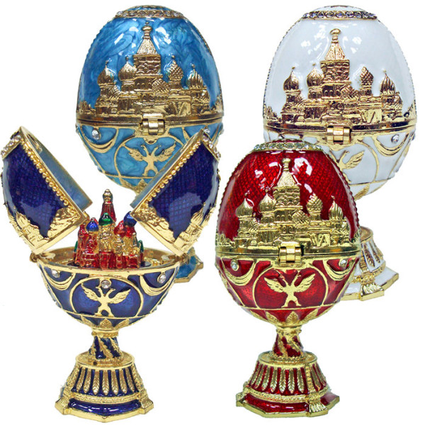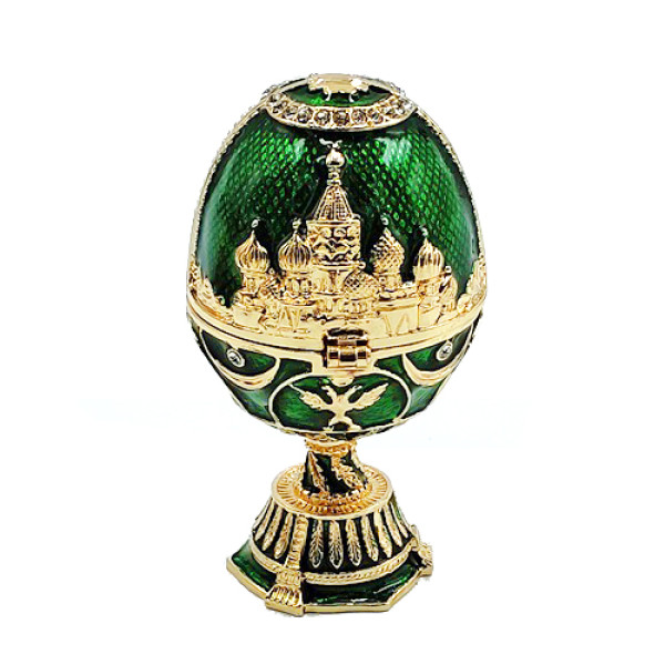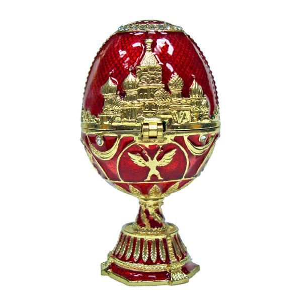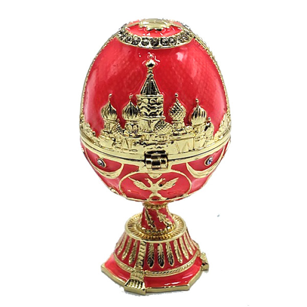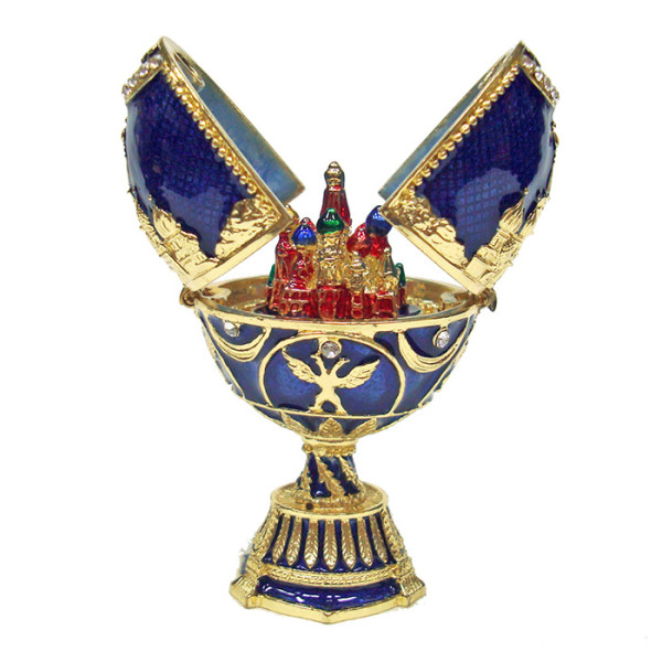 Яйцо-шкатулка под Фаберже внутри с храмом Василия Блаженного. Изготовлено из металла. Украшено стразами.