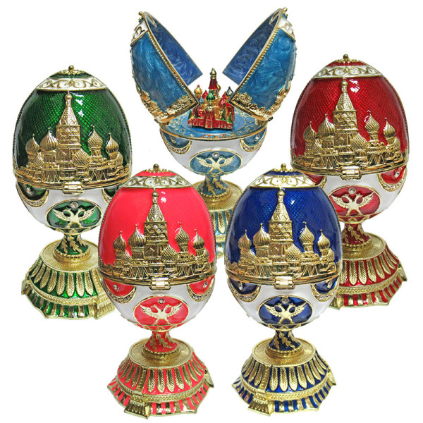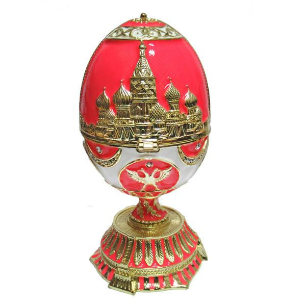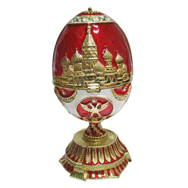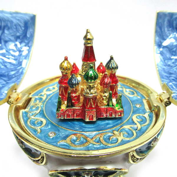 Яйцо-шкатулка под Фаберже внутри с храмом Василия Блаженного. Изготовлено из металла. Украшено стразами.