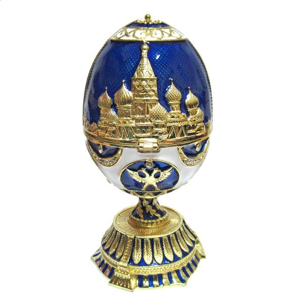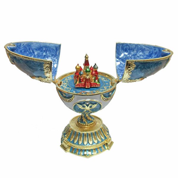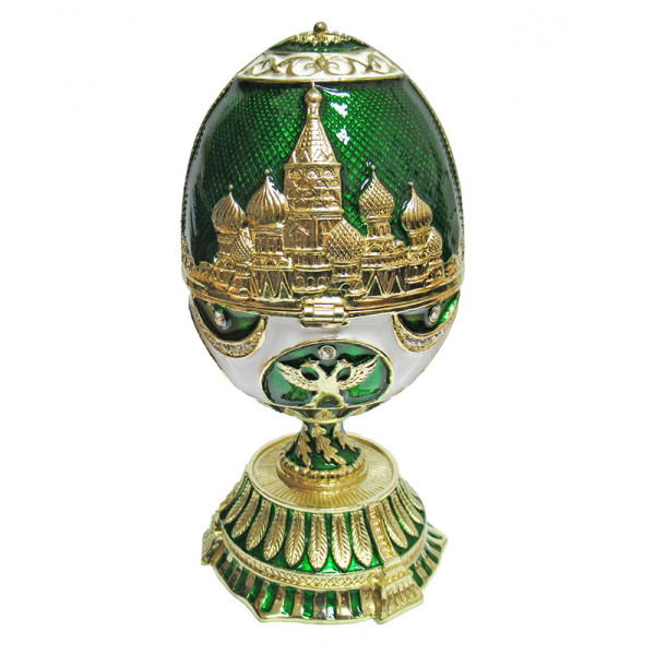 Яйцо-шкатулка под Фаберже музыкальное внутри с храмом Василия Блаженного. Изготовлено из металла. Украшено стразами.