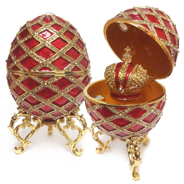 Яйцо-шкатулка под Фаберже внутри с короной. Изготовлено из металла, покрыто цветной эмалью. Украшено стразами.