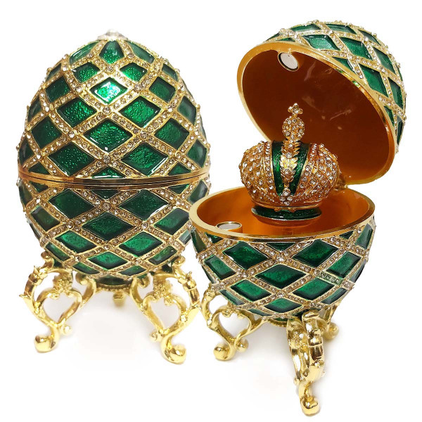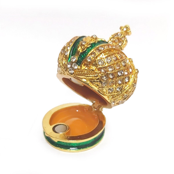 Яйцо-шкатулка под Фаберже внутри с короной. Изготовлено из металла, покрыто цветной эмалью. Украшено стразами.