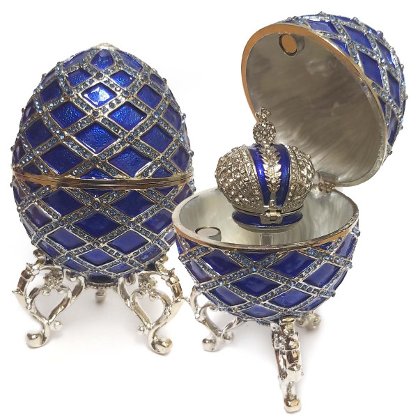 Яйцо-шкатулка под Фаберже внутри с короной. Изготовлено из металла, покрыто цветной эмалью. Украшено стразами.