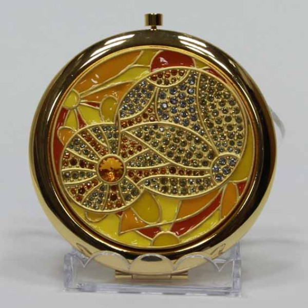 Зеркало двухстороннее косметическое из металла, украшено стразами. Внутри два зеркальца - обычное и увеличивающее.