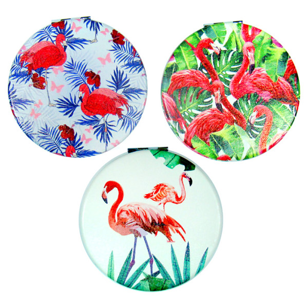 Зеркало металлическое с отделкой из искусственной кожи, двустороннее, круглое, на магните с разными изображениями Фламинго.
