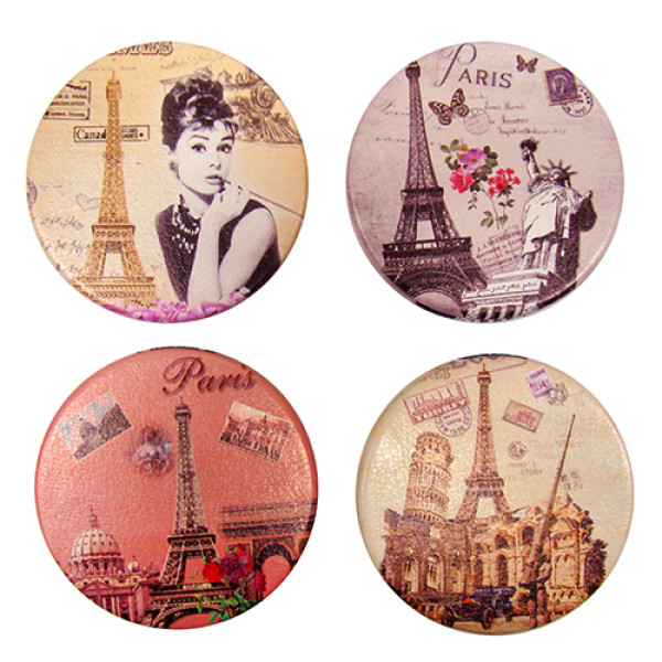 Зеркало металлическое с отделкой из искусственной кожи, двустороннее, круглое, на магните с разными изображениями Европейских городов.