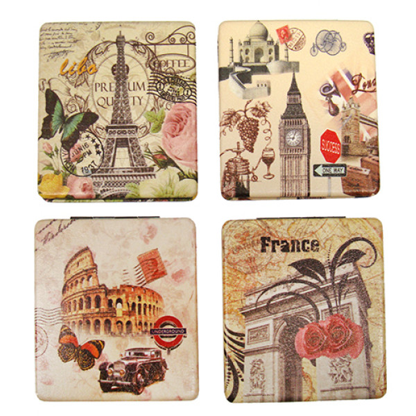 Зеркало металлическое с отделкой из искусственной кожи, двустороннее, прямоугольное, на магните с разными изображениями Европейских городов.