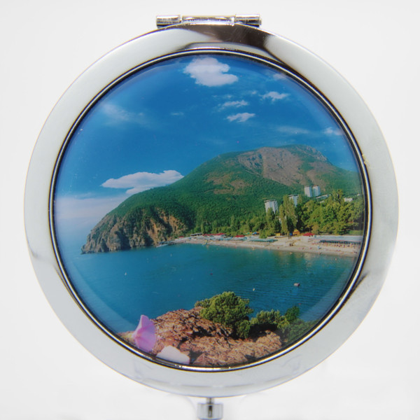 Зеркало металлическое, двустороннее, круглое, на защелке с видом на поселок Партенит и гору Аю-Даг (Медведь-гора).